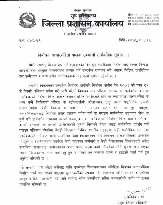 बैतडी- जिल्ला प्रशासन कार्यालय बैतडीले निर्वाचन आचारसहिंता पालना गर्न आग्रह गरेको छ । जिल्लाका केहि स्थानीय तहमा निर्वाचन आचारसहिंता उल्लंघन भएका गुनासाहरु आएकाले त्यसो नगर्न प्रशासनले आग्रह गरेको हो ।
